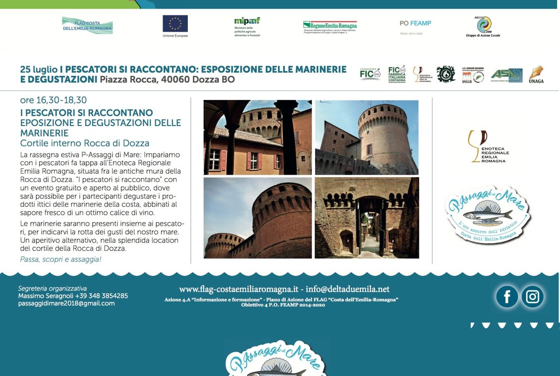 A seguito della settimana di apertura dell'iniziativa, svoltasi a , per la sua seconda tappa la rassegna itinerante P'assaggi di mare - La settimana dei prodotti ittici a FICO sbarca a #Dozza. Il 25 luglio, dalle ore 16.30 alle ore 19.00 nella splendida location della Rocca di Dozza, in collaborazione conEnoteca Regionale Emilia Romagna "I pescatori si raccontano" al pubblico con un aperitivo didattico alla scoperta dei gusti dei prodotti ittici locali.